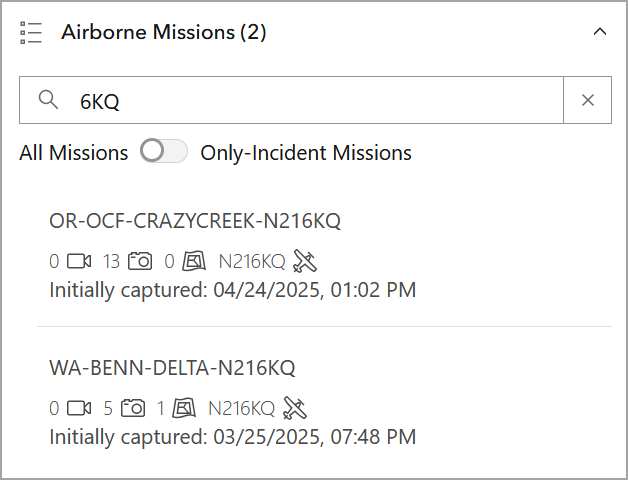The Airborne Missions section has been added to the Incidents panel. The Airborne Missions section let's you search for missions as well as filter only incident missions.