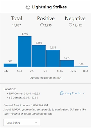 The Lightning Strikes feature let's you view and export strike counts. You can access the feature through the Lightning Strikes button in the upper right of the menu bar.